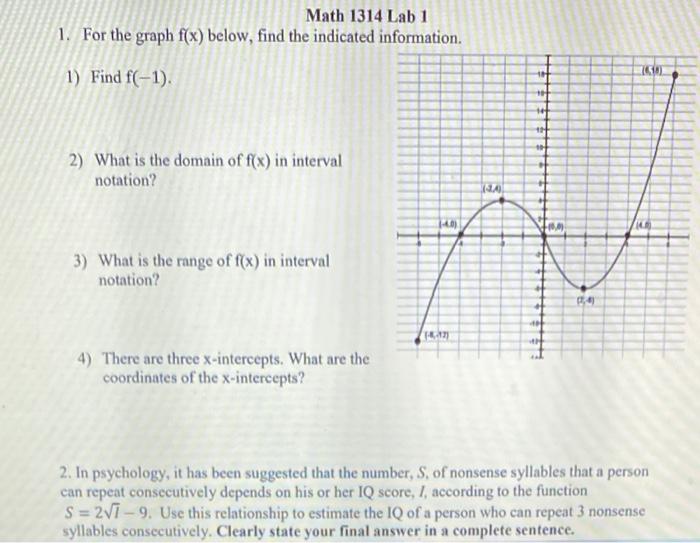 Solved Math 1314 Lab 1 1 For The Graph F X Below Find The Chegg Com